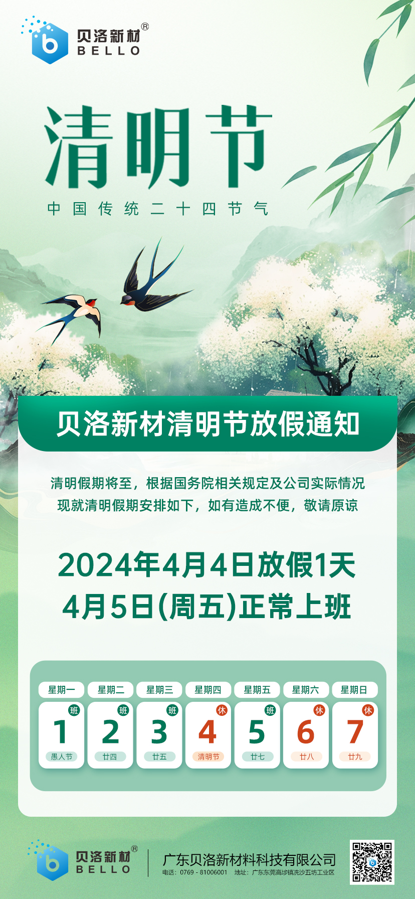 2024-04-03 15:04:402024年清明假期将至,根据国务院相关规定及公司实际情况,PA旗舰厅新材清明假期安排如下:4月4日放假1天,4月5日正常上班,如有造成不便,敬请原谅。
