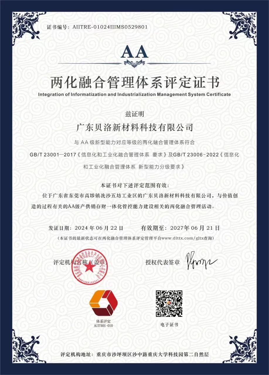2024-07-01 13:07:12广东PA旗舰厅新材料科技有限公司顺利通过国家工业和信息化部《信息化和工业化融合管理体系要求》(GB/T 23001-2017)及《信息化和工业化融合管理体系新型能力分级要求》(GB/T 23006-2022)体系认证审核,正式取得两化融合管理体系AA级认证,以及知识产权管理体系认证!