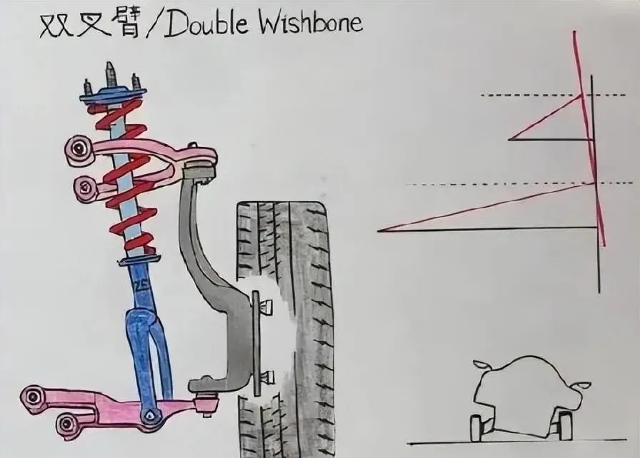 双叉臂悬挂可以看作是麦弗逊悬挂的改良升级版。它将原本由麦弗逊下臂单独承受的力分散到了两根连杆上。其最大优点在于,动态行驶中由于上臂短于下臂,能够改变车轮的外倾角,从而显著提升车辆的极限操控性能。不过,与麦弗逊悬挂相比,双叉臂悬挂的成本更高,且占用空间更大。橡胶垫圈的作用