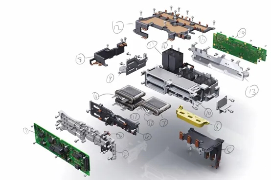 (1)驱动板,(2)驱动板支架,(3)高压母线采样线束,(4)三相输出叠层铜排,(5)三相铜排,(6)母线一体霍尔,(7)日立双面水冷IGBT模块,(8)叠层母排,(9)出水口盖板,(10)IGBT冷却水道,(11)母线电容,(12)正(或者负)母排,不知道哪个是正负,(13)进水口盖板,(14)控制板,(15)电容引脚焊接点,(16)IGBT中间四引脚焊接点,(17)IGBT粗引脚焊接处,(18)IGBT水道另一端盖板。密封圈是橡胶硅胶材料吗有毒吗