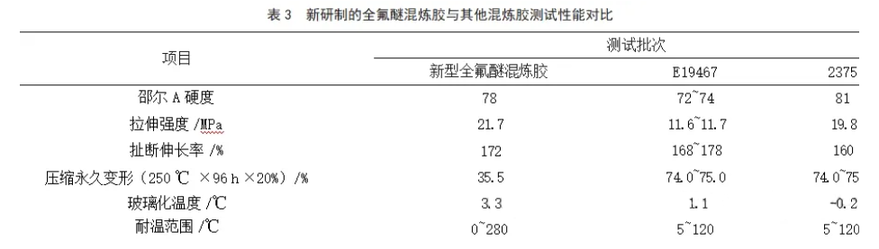 表3显示,新研制的FFKM混炼胶在常温拉伸强度与断裂伸长率上优于其他混炼胶,表明其力学性能突出。同时,高温压缩永久变形显著降低,能在280℃下稳定使用,展现出卓越的高温性能。表4则证实了其优异的耐介质性能,达到一级相容标准。氟橡胶产品