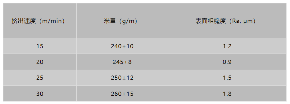 推荐范围:挤出速度15-30米/分钟,米重标准差小,粗糙度值(Ra)低。