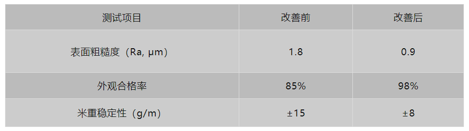改善前后:表面粗糙度从1.8 μm降至0.9 μm,外观合格率从85%提升至98%,米重稳定性提高。