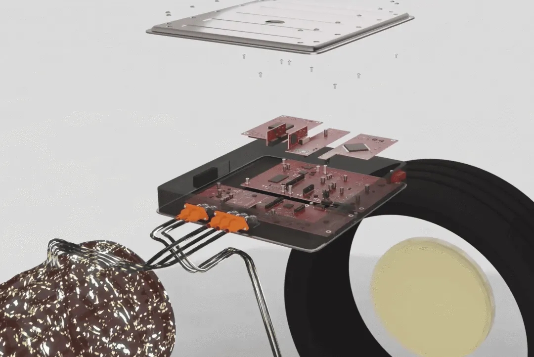 汽车逆变器中内部单元的图示示例,显示了多个PCB配置中的各种组件连接