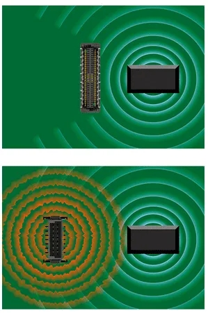 一个屏蔽连接器(上)和两个非屏蔽连接器(下)的比较。屏蔽选项不仅可以防止来自附近连接器的干扰,还可以防止其自身的信号干扰周围的连接