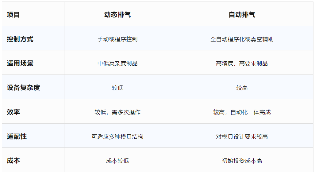 动态排气:通过模具的反复开合,动态排气能逐步排出模腔深处的气体,尤其适用于复杂型腔或厚壁制品。排气次数通常为2~4次,开合时间1~3秒,开模间隙0.5~2mm。