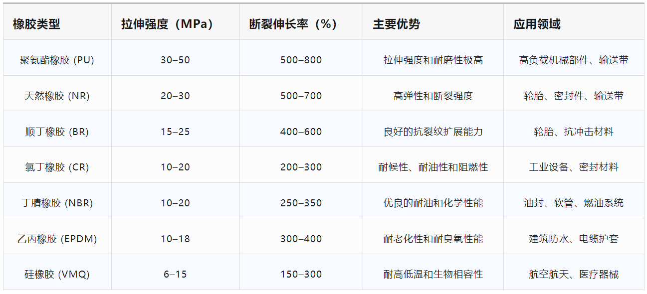综上所述,聚氨酯橡胶凭借其顶尖的拉伸强度和耐磨性在高性能橡胶中独占鳌头;天然橡胶则以其卓越的弹性和强度紧随其后;而氯丁橡胶凭借均衡的拉伸强度、耐候性和阻燃性,在工程和工业领域占据重要地位。各类橡胶材料依据其独特的性能特点,在各自的应用场景中发挥着不可替代的作用。