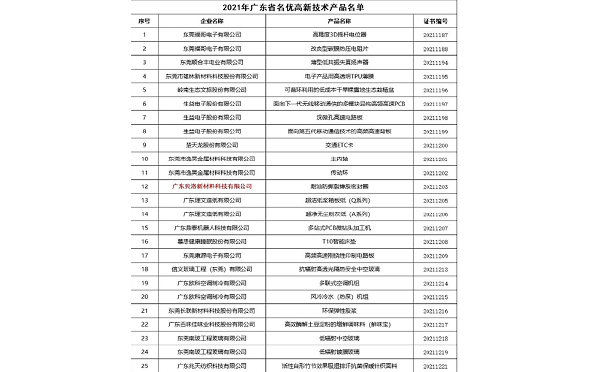 2022年2月22日上午,广东省高新技术企业协会发布了《关于公布2021年广东省名优高新技术产品名单的通知》,东莞市申报项目平均通过率16.8%,其中,东莞市高新技术产业协会48家会员单位73项产品获评2021年广东省名优高新技术产品,通过率27.4%,广东PA旗舰厅新材料科技有限公司顺利入选,热烈祝贺以下入选会员单位。