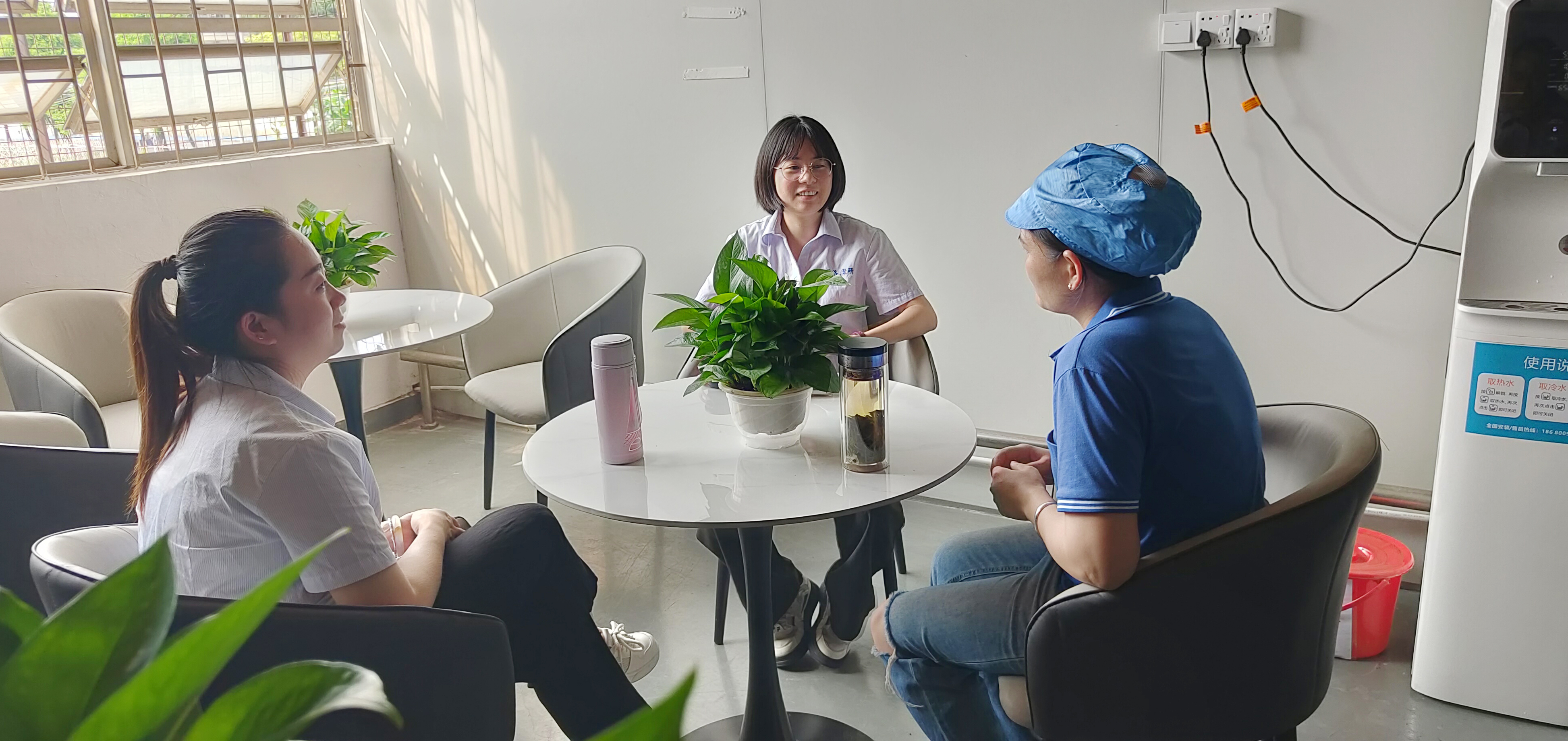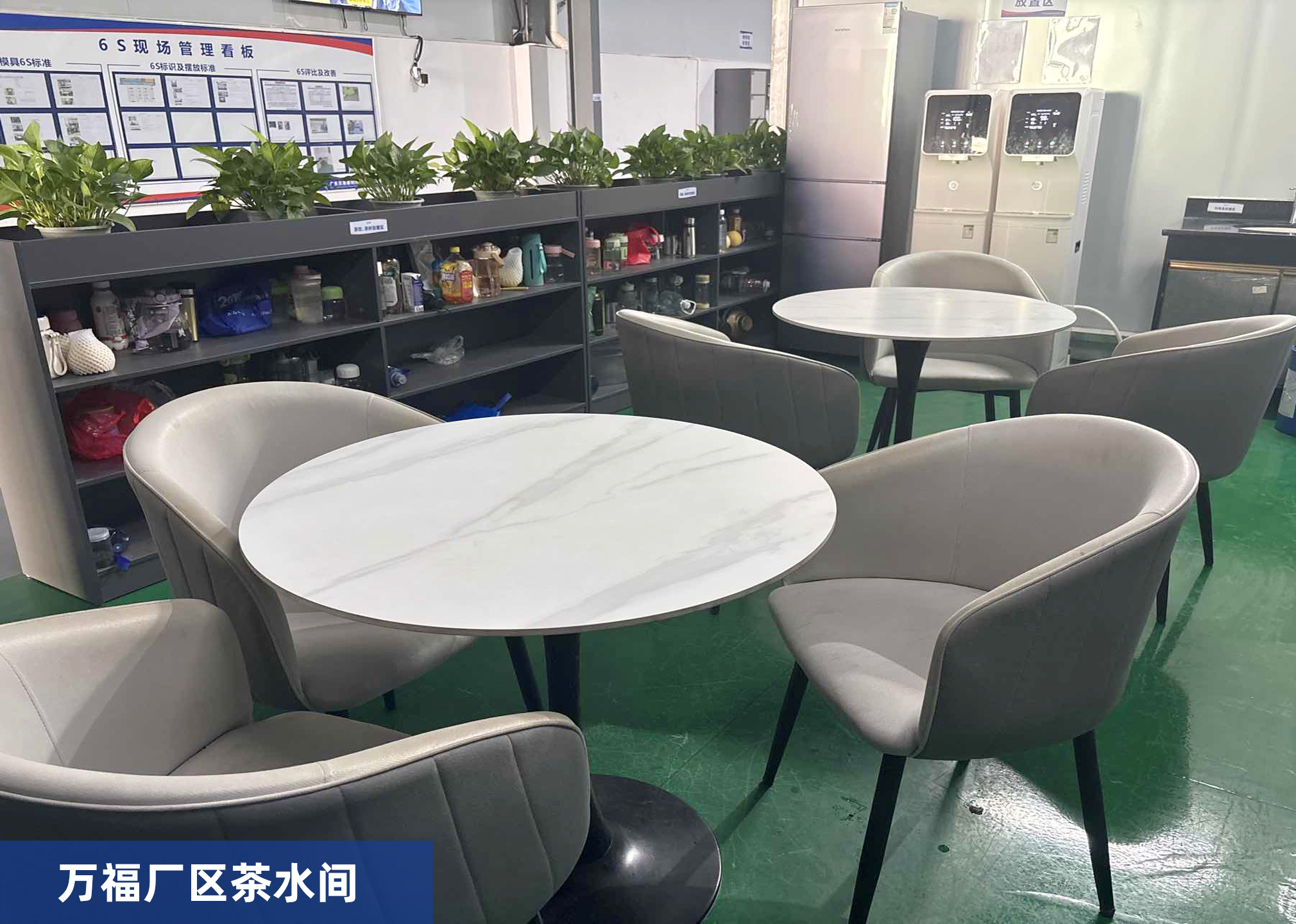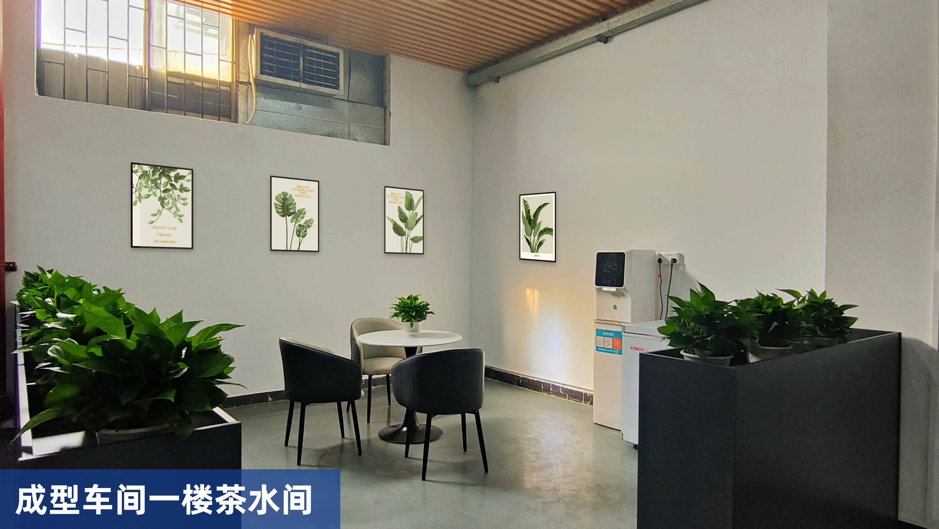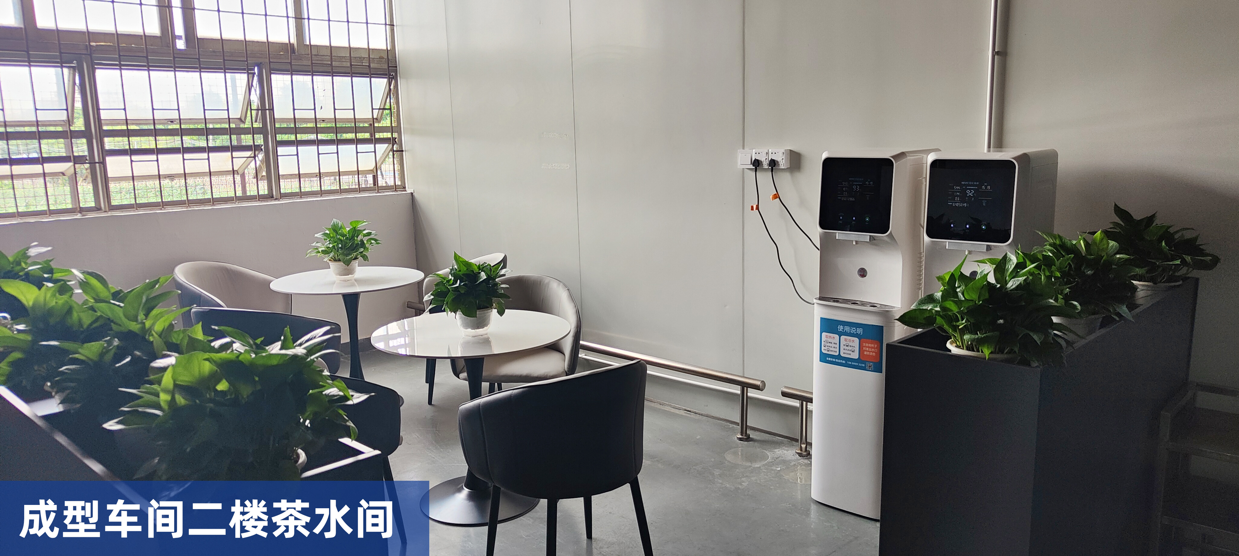 车间茶水间不仅设备齐全,环境也十分舒适。设有自热饮水机、舒适的座椅和茶几,还有公用冰箱,为大家提供了冷藏食物和饮品的便利,杯具放置处则方便大家存放和使用个人杯具。