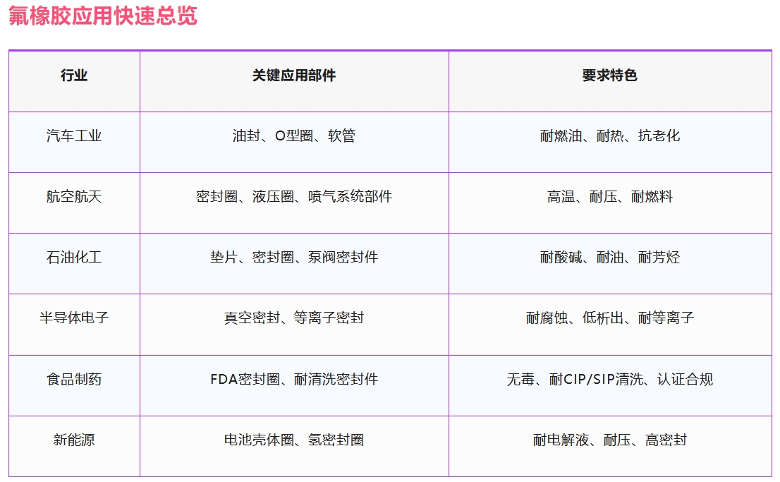 氟橡胶(Fluoroelastomer,简称FKM或FPM)简直就是材料界的“全能王”,耐高温、耐油、耐化学品、耐臭氧、耐老化,这些厉害的本事让它在高端工业领域里大放异彩。下面就是它大展身手的“战场”盘点: