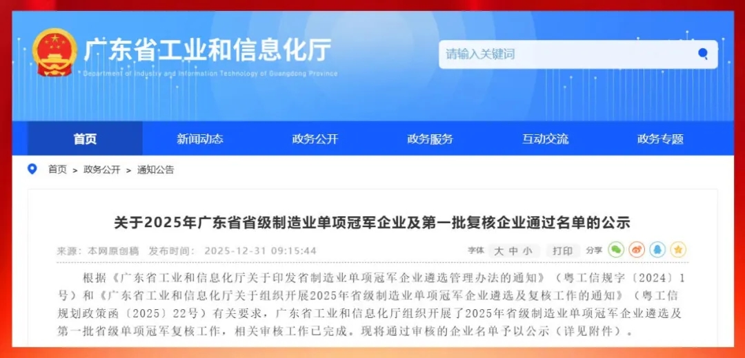 2025年12月31日,广东省工业和信息化厅发布了《2025年广东省省级制造业单项冠军企业及第一批复核企业通过名单的公示》,广东PA旗舰厅新材料科技有限公司成功入选省级制造业单项冠军企业。