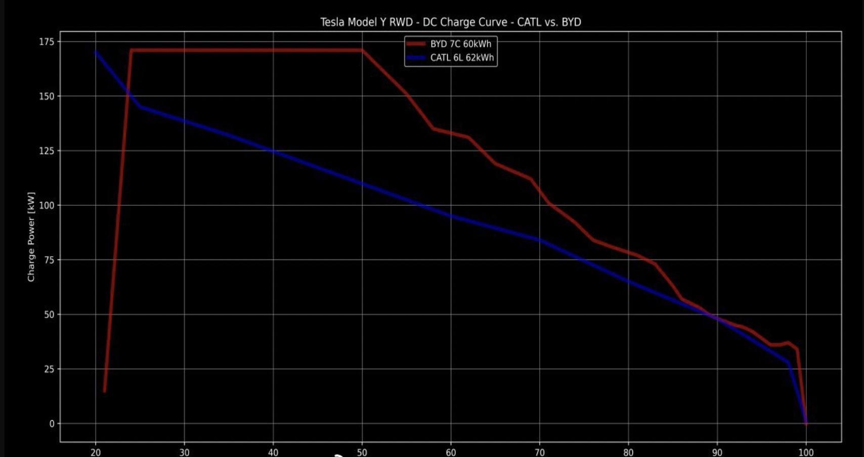 有用户分享了这款车型的实测充电功率数据,刀片电池版本的Model Y充电峰值功率达到170kW以上,15分钟就能从11%充至71%。对比宁德时代版本,可以看到比亚迪版本的高功率充电时间维持的更长,充电功率也比较高。
