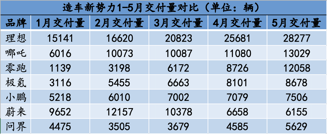 如上图所示,这是新势力们公布出来的交付量,以及1-5月份每个月的交付量。